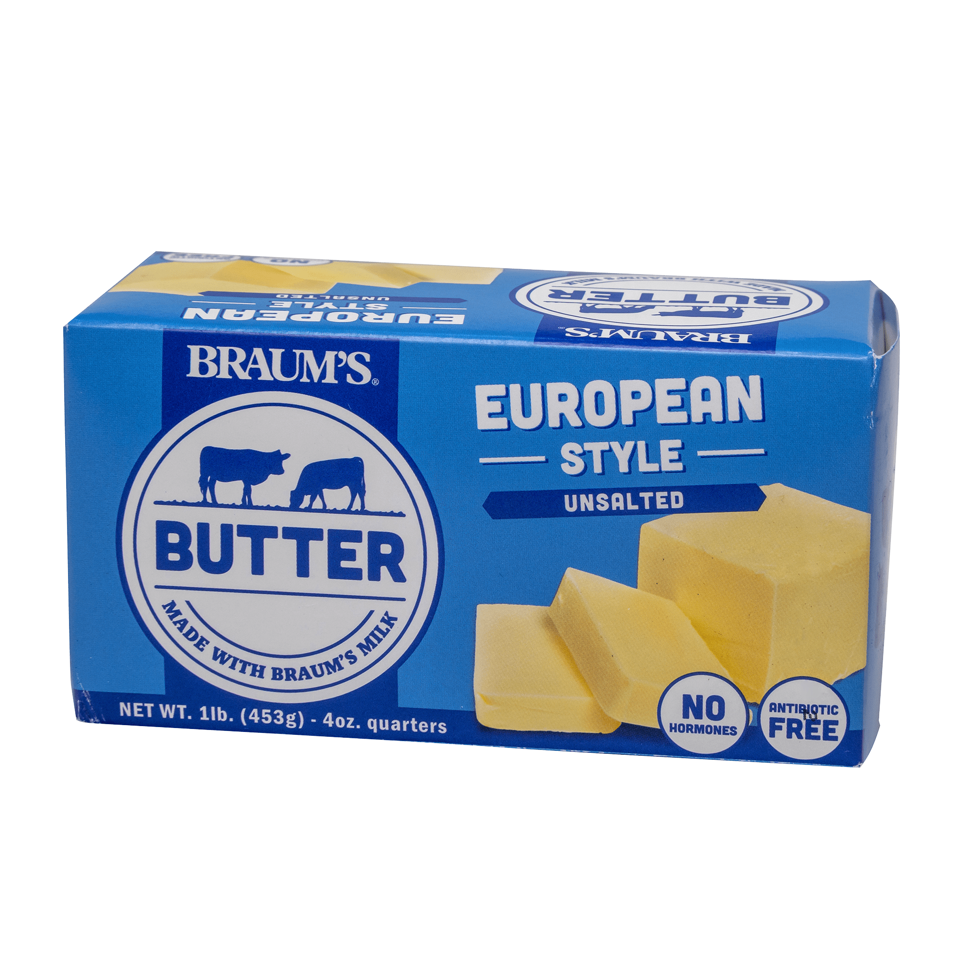 Braum’s new-and-improved butter is made at our very own processing plant using fresh milk and cream from our private dairy herd. Choose from Cultured Sweet Cream with Sea Salt or European Style Unsalted Butter. Both kinds of butter are available in a one pound box with four 4-ounce sticks inside.