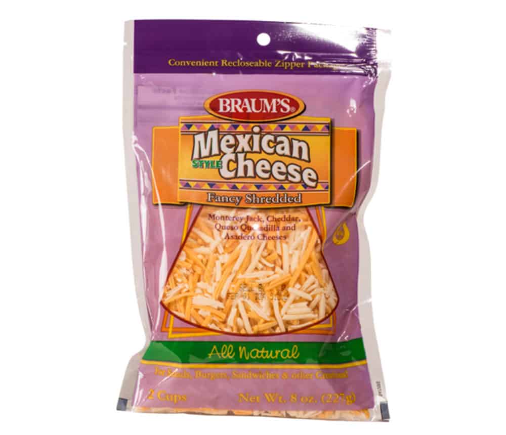 Braum’s shredded cheeses include Parmesan, Italian Style (Mozzarella, Cheddar, Provolone, and Asiago), Mozzarella, Cheddar, and Mexican Style (Monterey Jack, Cheddar, Queso Quesadilla, and Asadero). Braum’s deli sliced cheeses include Baby Swiss, Colby Jack, Medium Cheddar, and American Singles. Try Braum’s block cheese which includes: Colby Jack, Extra Sharp Cheddar, Medium Cheddar, Colby, Pepper Jack, Mild Cheddar, and Muenster.