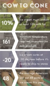 Great ice cream begins with great milk and great cream. These two ingredients are the backbone of genuine ice cream, and if they aren’t the very best, you’ll be able to taste it in the final product. To be ice cream – and not light ice cream or frozen yogurt – your dessert needs at least 10% milk fat. Ice cream with a chocolate base can be 8% milk fat, because the fat present in the chocolate will bring the total fat content into acceptable levels. Light ice cream, on the other hand, can only have around 6% milk fat to qualify. We source our milk and cream from our very own dairy herd, which means the dairy in our ice cream has the shortest possible trip from the field to where it’s made into ice cream. That kind of freshness just can’t be beat.