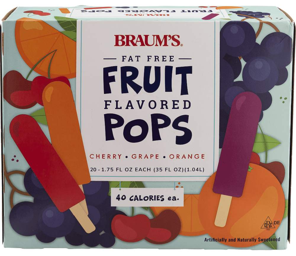 Braum’s Fruit Pops come in three delicious flavors – grape, orange, and cherry. Each box has 24 individual pops! Great treat and fun to eat.