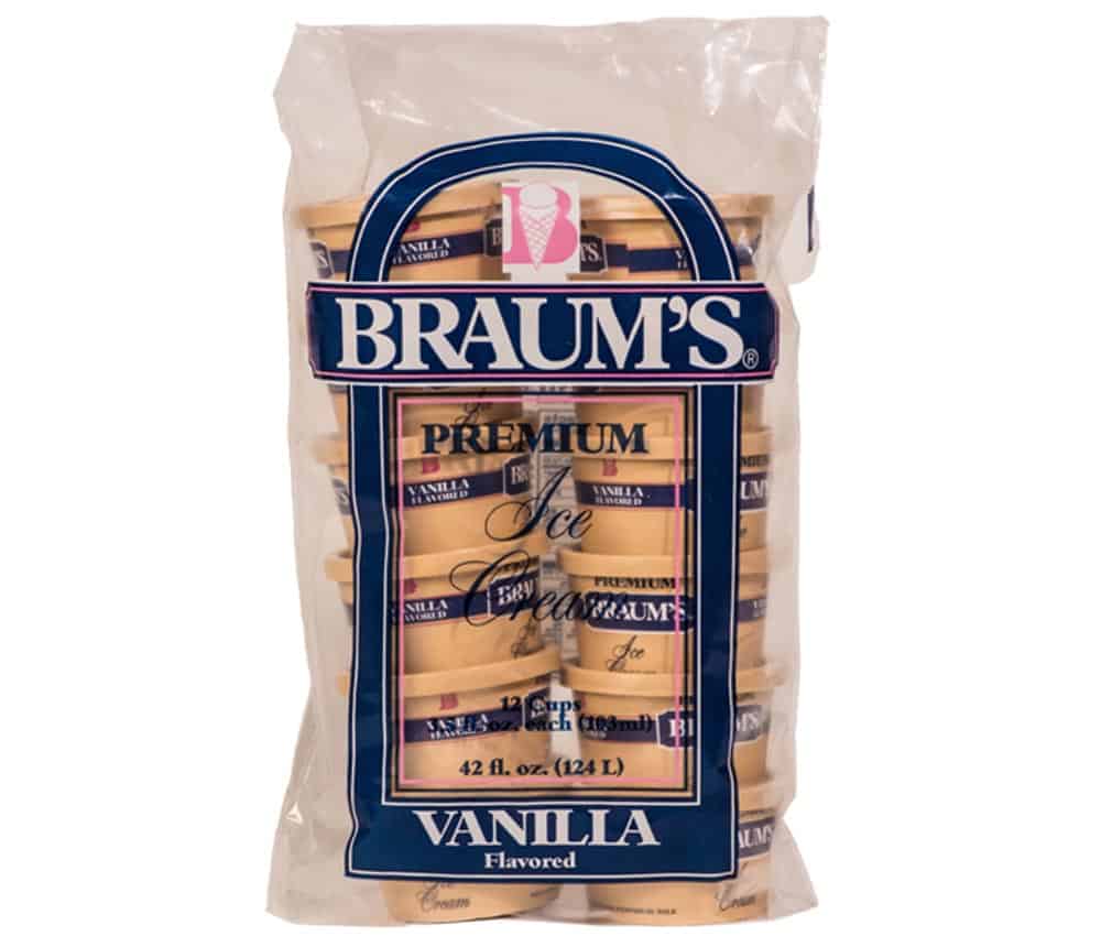Our delicious taste of Braum’s Premium Vanilla Ice Cream in handy and convenient 3 oz. cups. All you need is a spoon and you have a delicious treat anytime! Great for kids of all ages! Braum’s Ice Cream Cups are also available in Chocolate and Strawberry! (12 per bag).