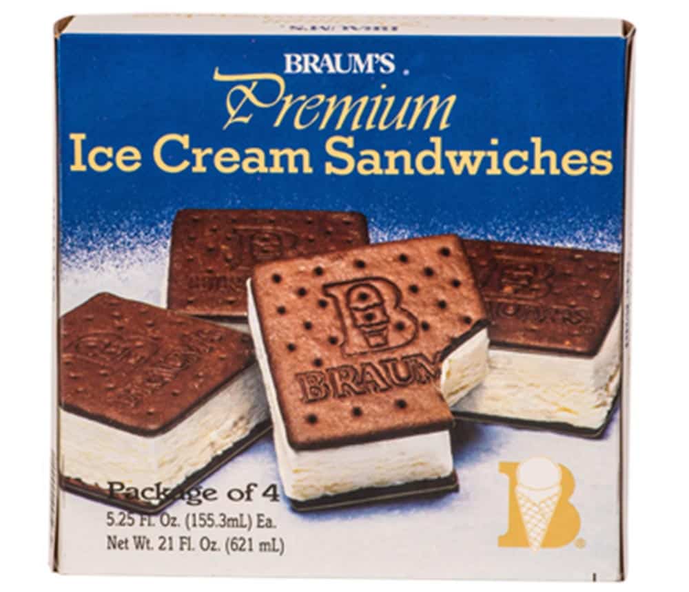 Great-tasting individually wrapped ice cream sandwiches of Braum’s Vanilla Ice Cream nestled between two chocolate wafers. Great dessert or snack anytime. Braum’s Premium Ice Cream Sandwiches are available in packages of 4 or 12.