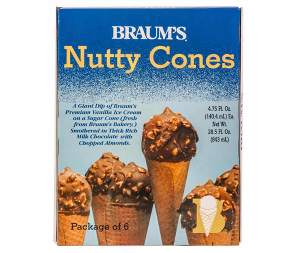 Braum’s Nutty Cones come 6 to a box, each with a giant dip of our premium vanilla ice cream on a sugar cone – fresh from Braum’s bakery – smothered in thick rich milk chocolate with chopped almonds. It’s a favorite among our frozen snacks.