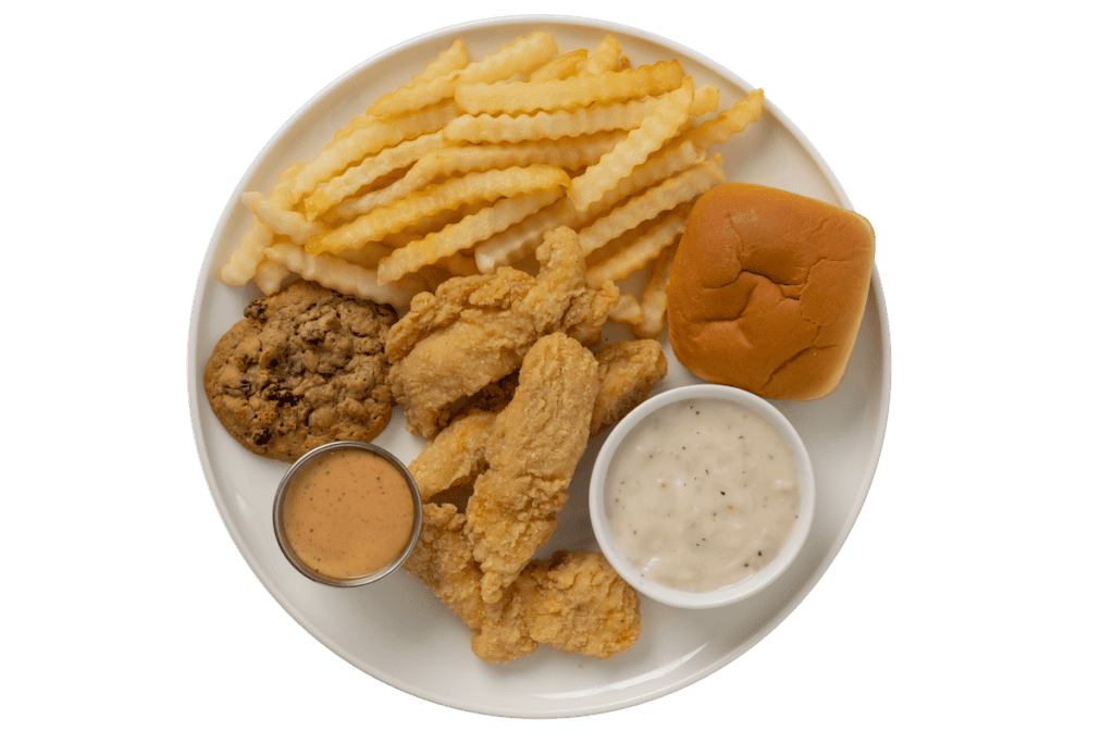 If you love chicken, then you have to try Braum’s Chicken Strip Dinner! It comes with four deliciously seasoned 100% all-white chicken breast strips, golden crinkle cut french fries, our creamy country gravy, and our new Braum’s Dipping Sauce that packs a bold, southwest kick. Oh, and don’t forget the dinner roll and cookie (baked fresh in our bakery)! Great for lunch or dinner!