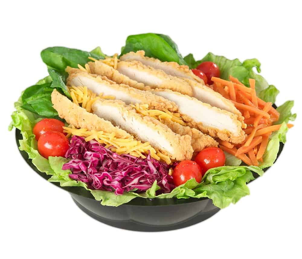 Our chicken strip salad is made with strips of breaded chicken served atop fresh lettuce, crisp carrots, cabbage, grape tomatoes, spinach leaves, and dairy-fresh shredded cheddar cheese. Served with your choice of dressings and seasoned croutons. Enjoy one for lunch or dinner! Also available at our Grill!