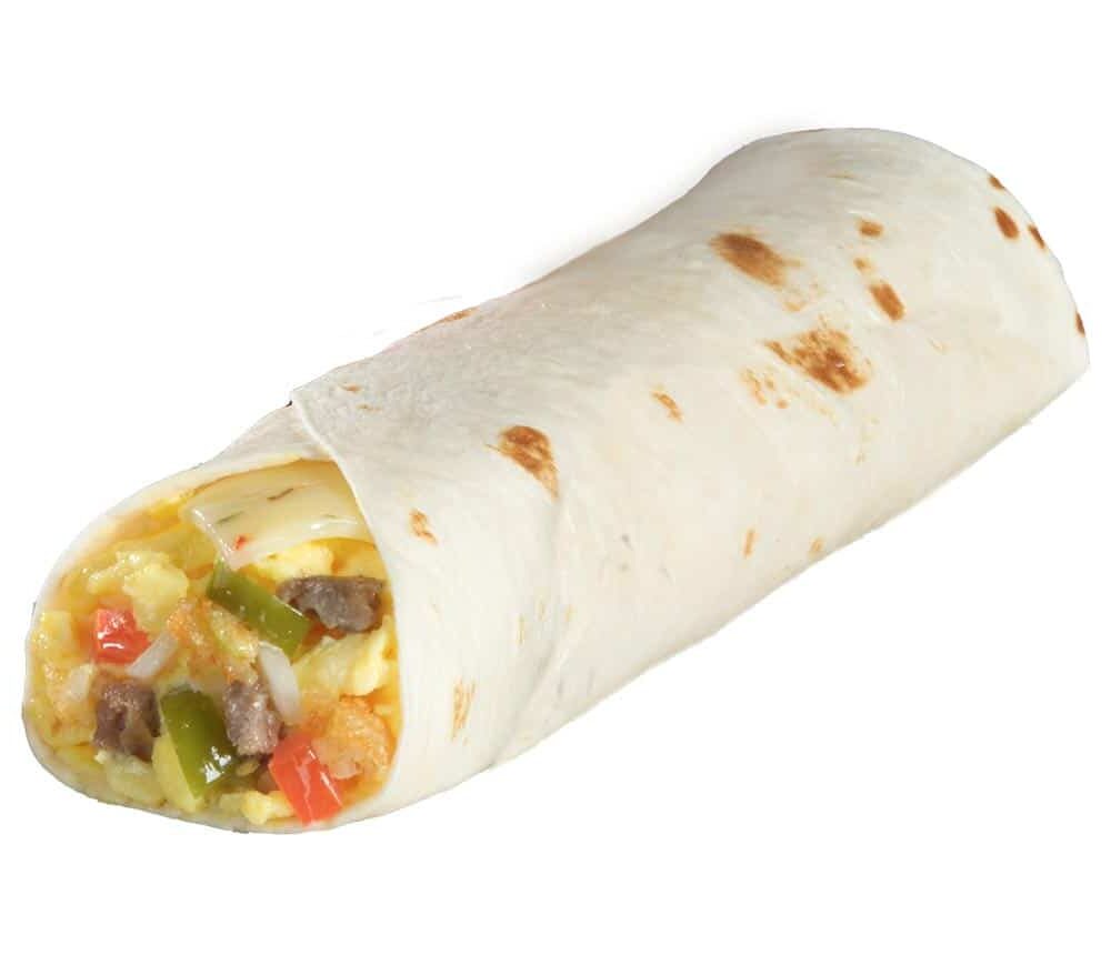 Braum’s Grande Breakfast Burrito is a breakfast burrito with a kick! We start with a warmed flour tortilla and we fill it with fresh scrambled eggs, lots of country sausage, mounds of pepper jack cheese, fresh onions, and tomatoes. But that’s not all! We add spicy jalapenos and crispy hash browns! Start your day the Braum’s way!