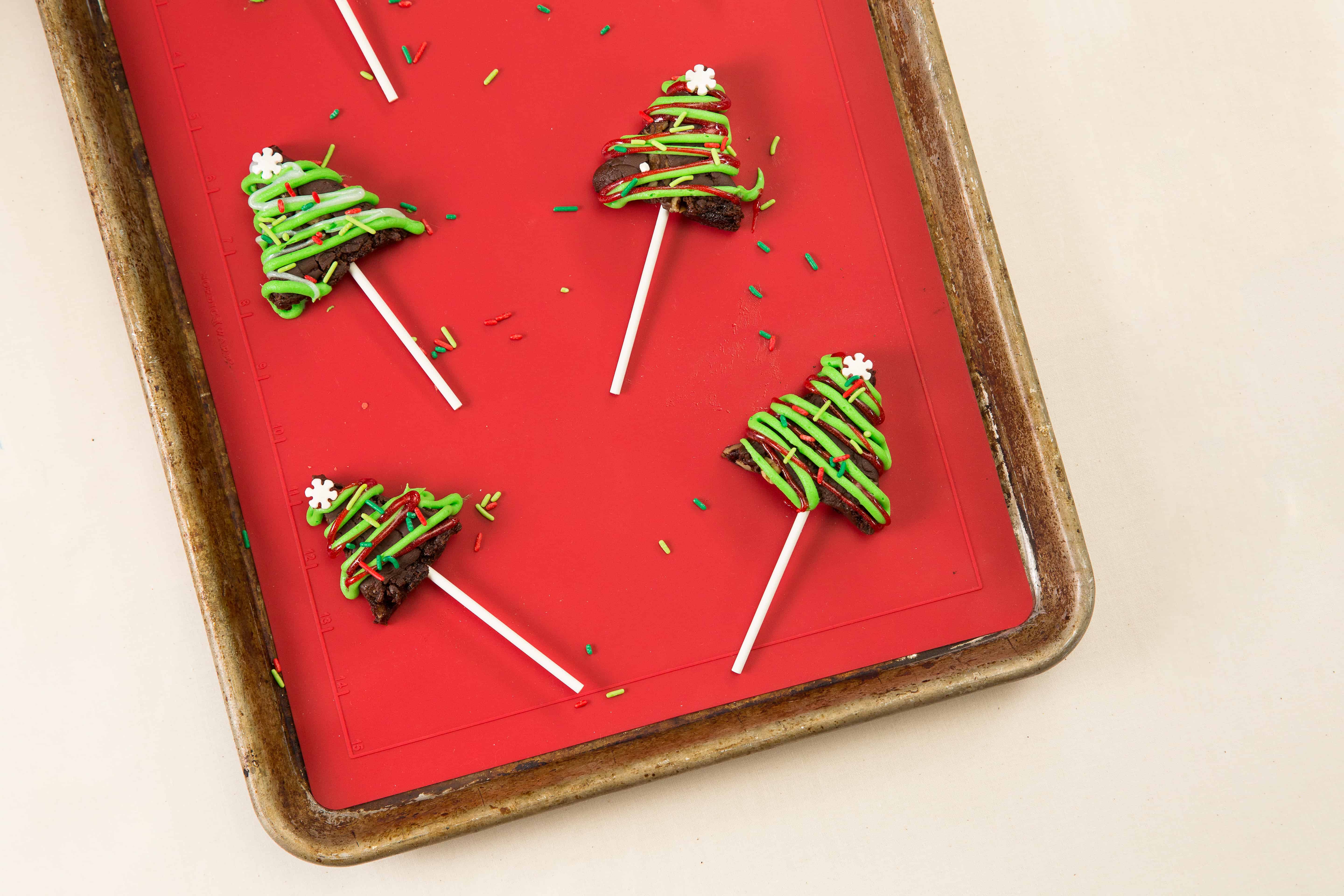 4. Break the peppermint sticks in half and insert into the bottom of the brownies.