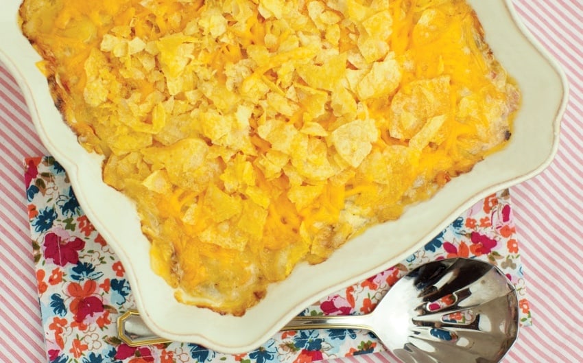 2. Place turkey in a large bowl and add all remaining ingredients except potato chips and cheddar cheese.