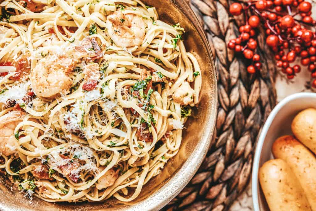 8. Stir in the drained pasta, the reserved 1⁄2 cup of pasta water, bacon, and cooked shrimp, tossing until noodles are well coated in sauce. Serve in warm pasta bowls with a generous sprinkle of parmesan cheese and some freshly cracked black pepper.