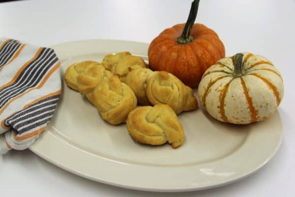 - Bake the Jack-o’-lanterns at 375 degrees for five to seven minutes or until they are golden brown. Cut into quarters and serve.