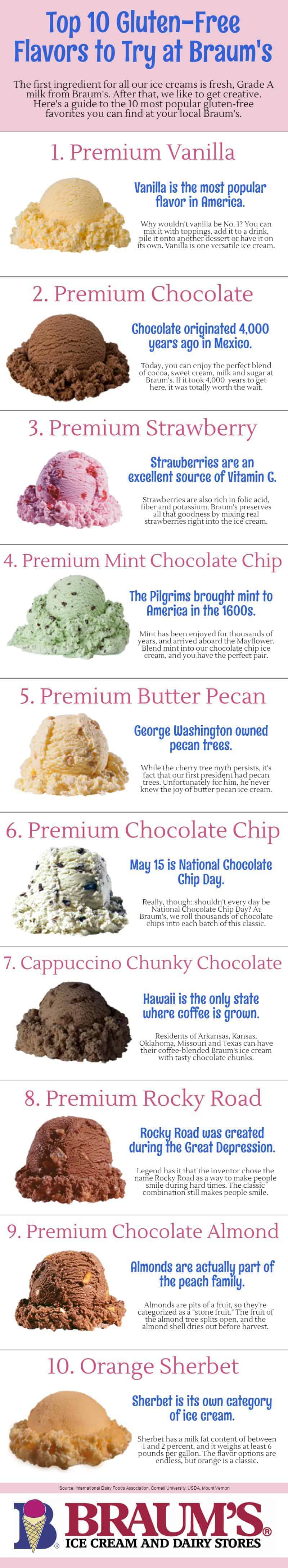 To help those with celiac disease, gluten sensitivity, and special diets, we have created a list of 10 of the most popular Braum’s flavors that are gluten-free. There are dozens more, so be sure to check the ingredients listed with our premium ice cream, regular and no sugar added frozen yogurts, and sherbets.