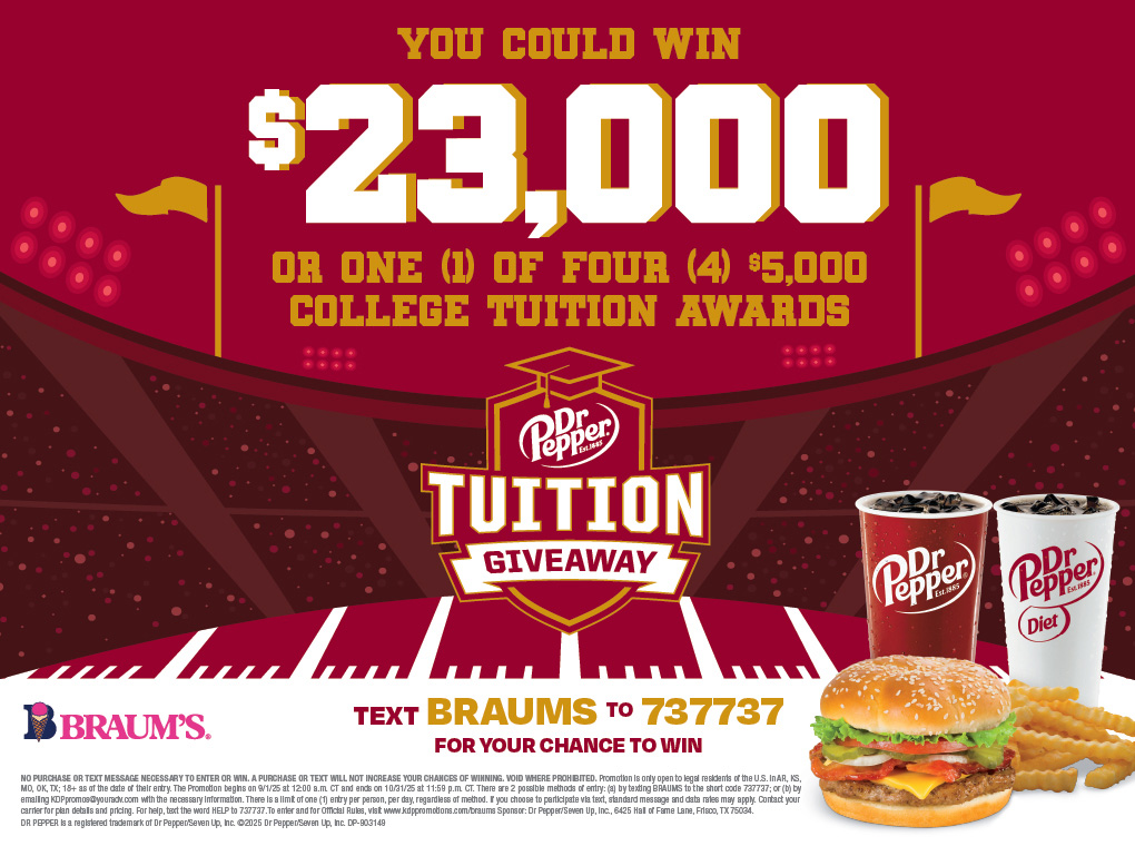 To enter, text BRAUMS to 737737. You can enter once a day now through October 31st for a chance to win up to $23K! Each entry puts you in a drawing to win one of (4) – $5,000 prizes or the Grand Prize of $23,000!