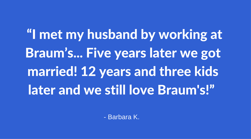“I met my husband by working at Braum’s! I started working there the summer before my senior year in high school and he had been working there for a year or so. Five years later we got married! 12 years and three kids later and we still love Braum’s!