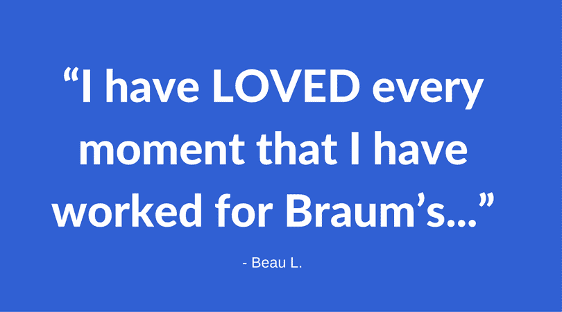 “My first job experience, at the Joplin, MO Braum’s, was back in 2014 when I was first hired on… this was my very first job and when I reported in for my first day, I was beyond scared! After orientation I got a lot of hands on experience and at first I was called a turtle because of how slow I moved, and then something clicked and I became a superstar on the cone line and register four… After about a year and a half, I was promoted to night shift supervisor.